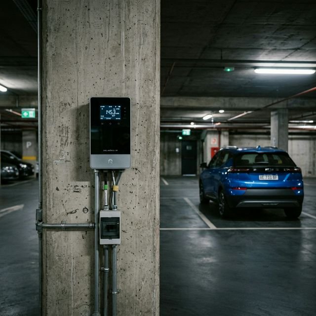 El esquema comienza en tu plaza de estacionamiento. Junto a tu toma de carga se instala un contador electrónico estanco, mucho más chico que la caja gris típica de la distribuidora.